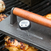 Featuring a sturdy wooden handle that remains cool to the touch, it provides a safe and reliable grip even over the hottest coals. Its natural weight—3 lbs of cast iron muscle—adds just the right pressure to your Wagyu Angus cuts, locking in flavor and creating that signature crust every steak lover craves.